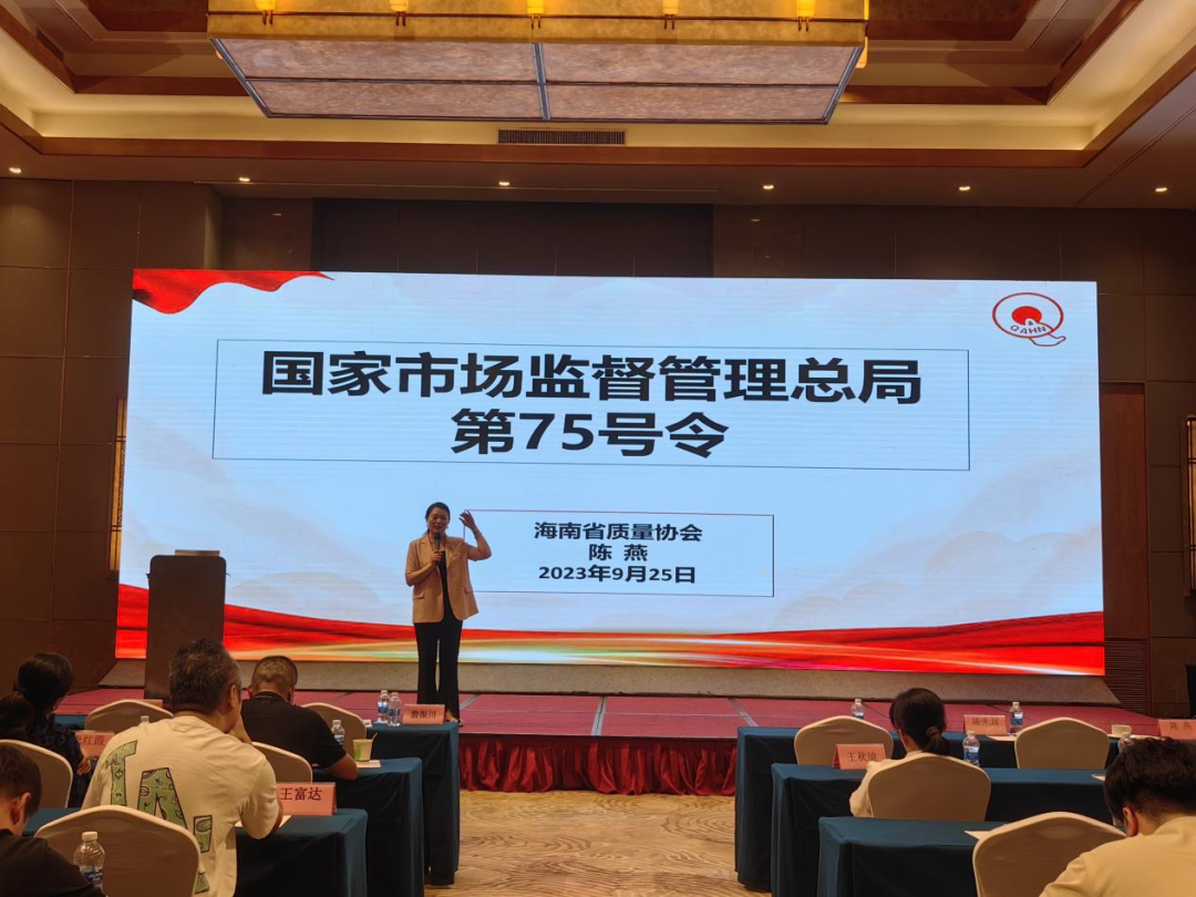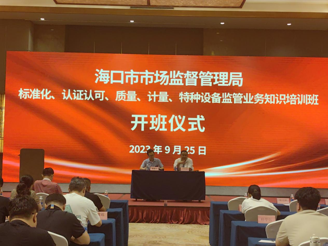 为进一步贯彻落实“质量月”有关活动精神,提高监管能力和效率,推进海南自由贸易港建设,营造公平有序的市场环境,2023年9月25日,由海口市市场监督管理局主办的标准化、认证认可、质量、计量、特种设备监管业务知识培训班顺利开班,海南省质量协会副会长兼秘书长陈燕受邀参加并授课,此次培训班共有来自市局机关科室、标准化科、认证认可科、质量科、特设科、分局分管领导、市场科、监管所、执法支队各科室、各大队等相关负责人参加。海口市市场监督管理局副局长郑廷安莅临现场并讲话。